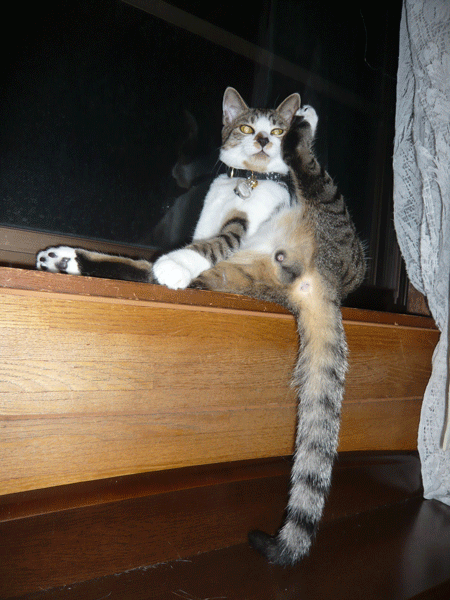 周辺をよく見ると、黒と茶色のまだらニャンコ、