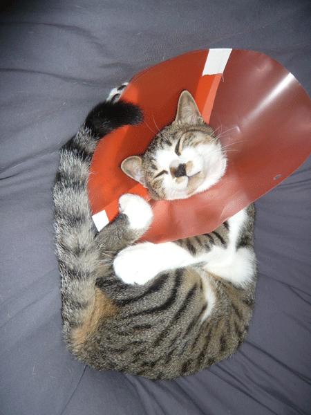 おそらく患部を舐めようと暴れカラーで切ったのでは?と。